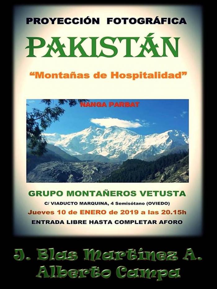 Relatada proyección fotográfica dedicada a mostrar la gran hospitalidad que desprende el pueblo pakistaní, a través de un viaje hacia sus alturas, donde llegando hasta el campo base de uno de sus ochomiles, el Nanga Parbat, y luego visitando sus principales ciudades, se traslada en imágenes sólo una pequeña parte de esa gran belleza de Pakistán, sus montañas y sus gentes.